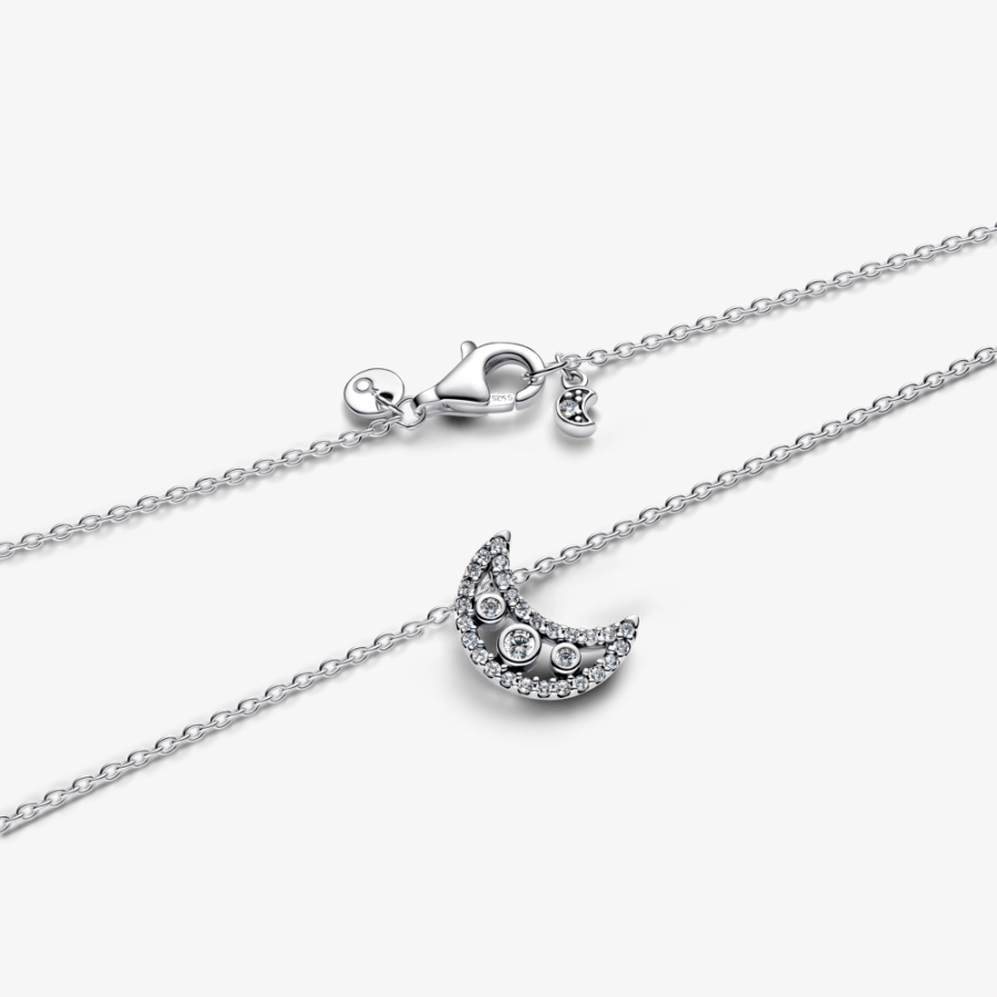 This elegant silver-toned necklace features a crescent moon pendant adorned with delicate crystal details, bringing a subtle sparkle and a calm, celestial charm. Its refined design makes it perfect for everyday wear, whether worn alone or layered for a more personal look.