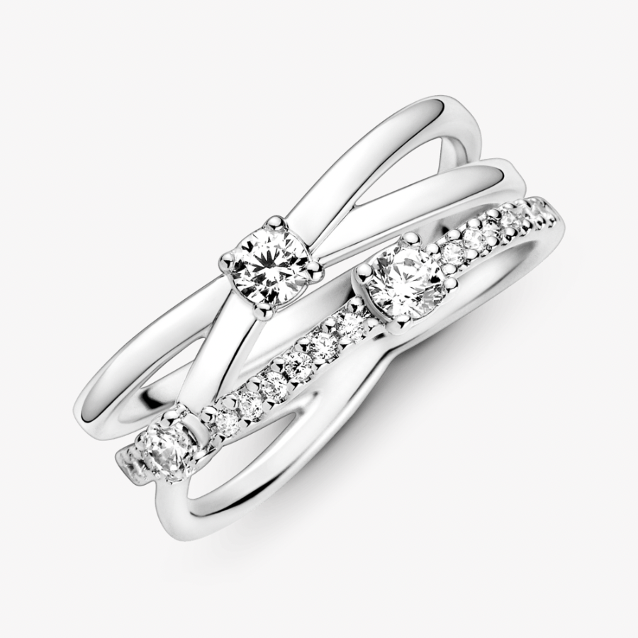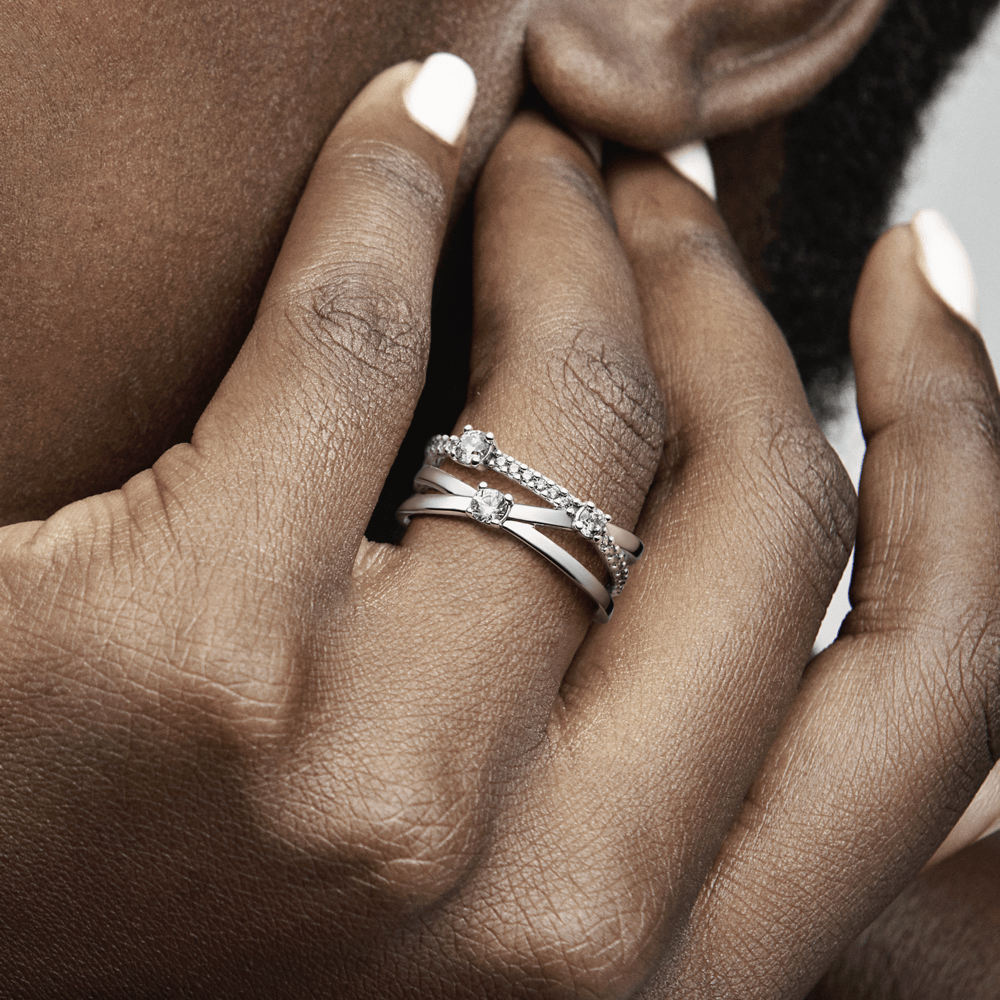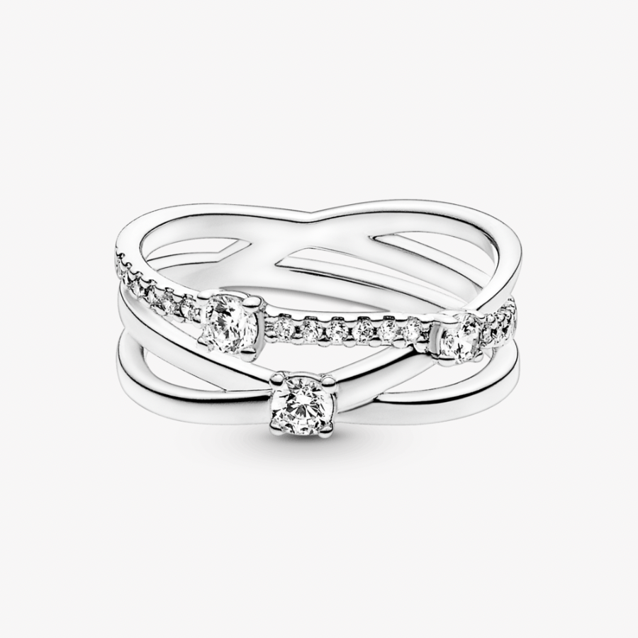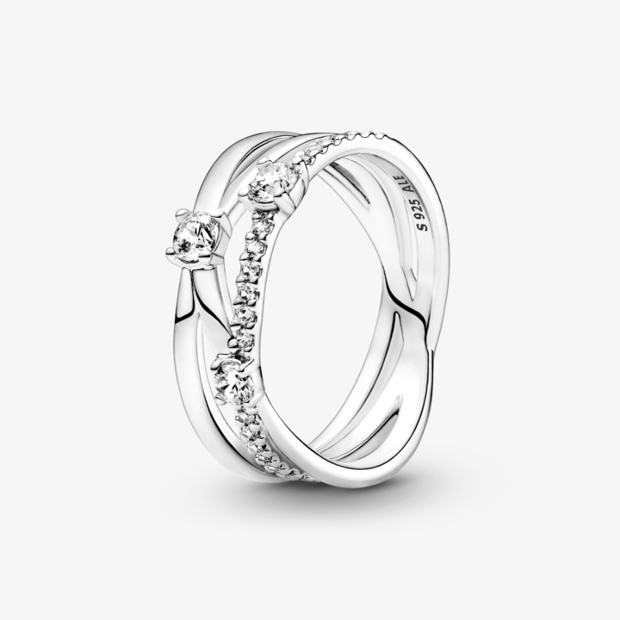 This refined silver ring features an intertwined design highlighted by subtle zircon detailing. Its balanced proportions and clean finish make it an elegant piece for everyday wear, offering a modern touch without excess.