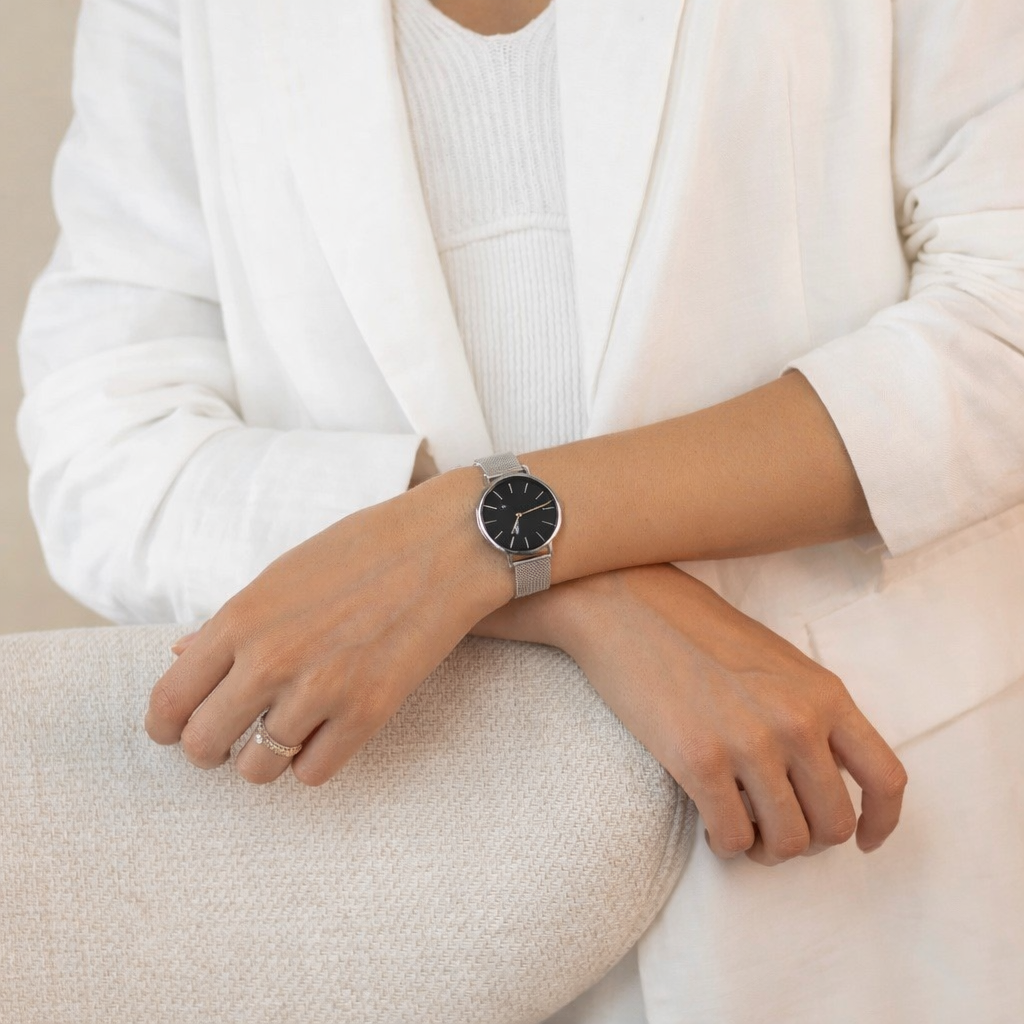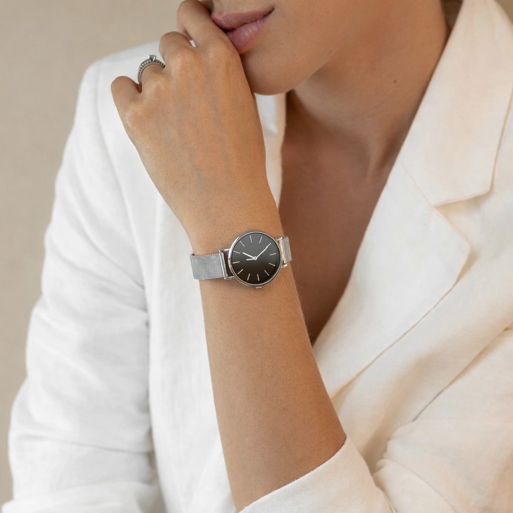This watch presents a clean, modern elegance through its black minimalist dial paired with a refined silver mesh bracelet. The balanced design feels timeless and versatile, making it an easy choice for everyday wear, work settings, or more polished occasions. A subtle statement piece created to complement your style with quiet sophistication.